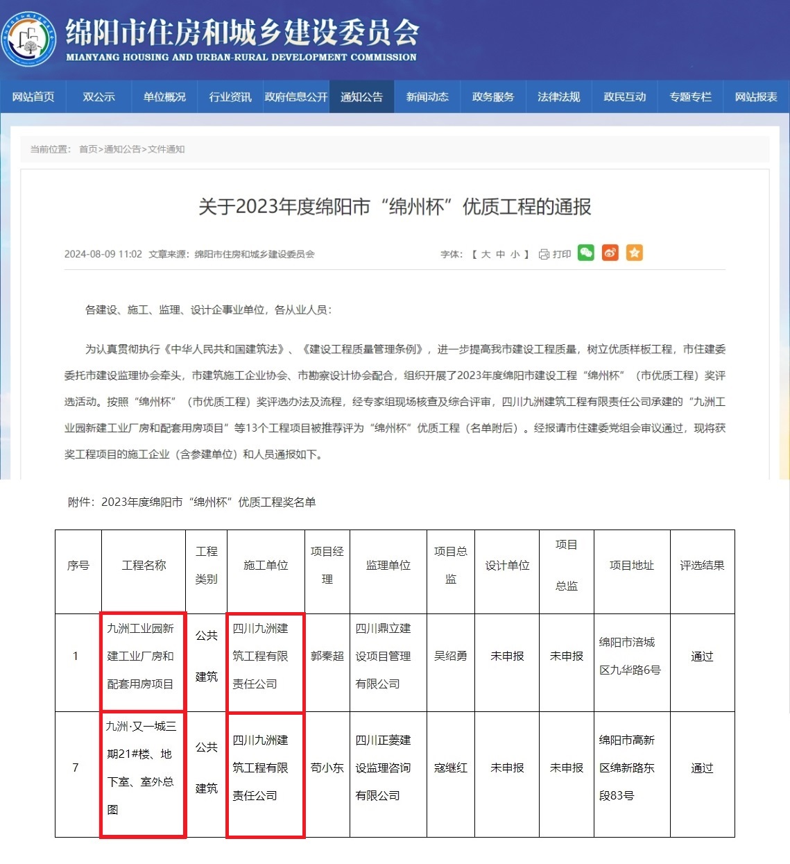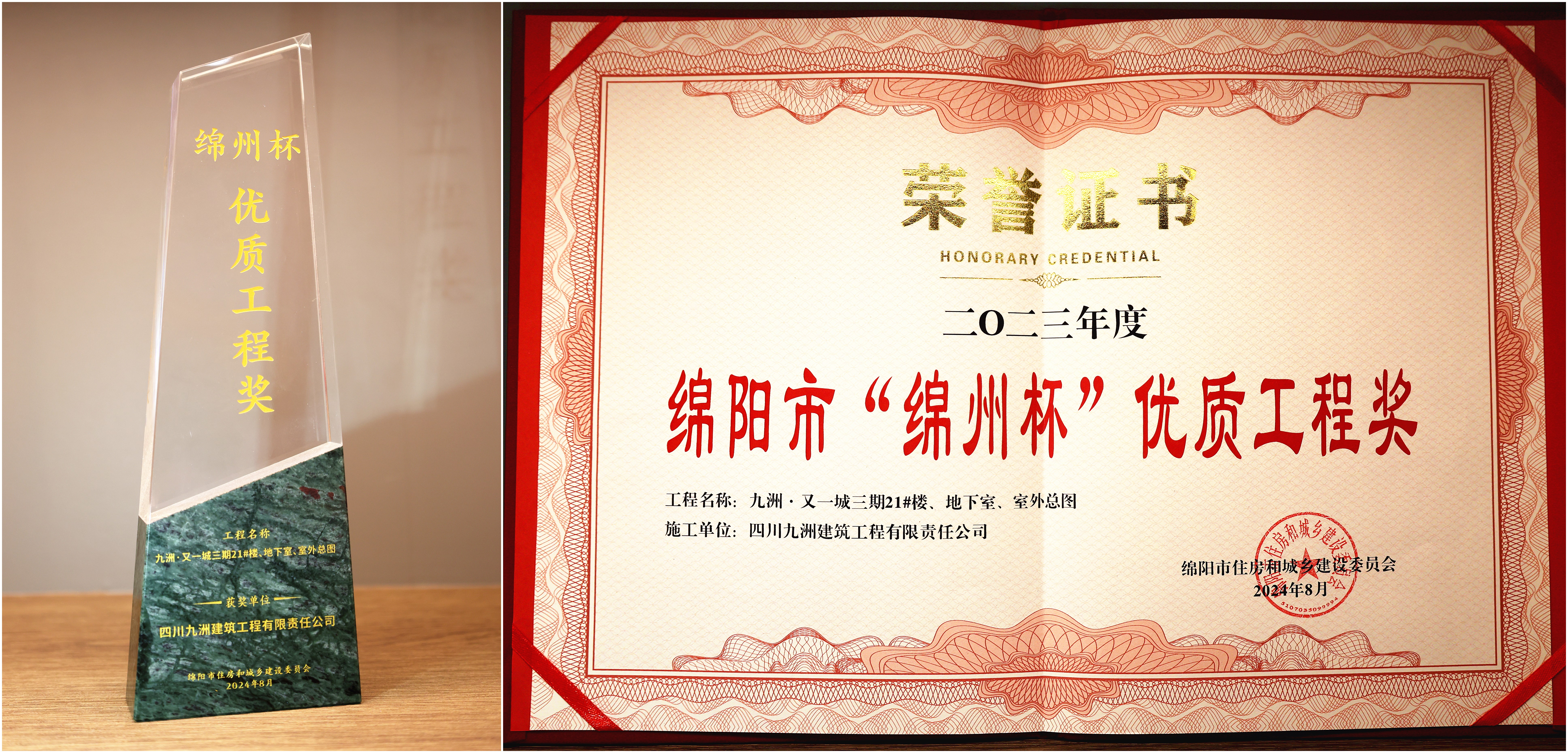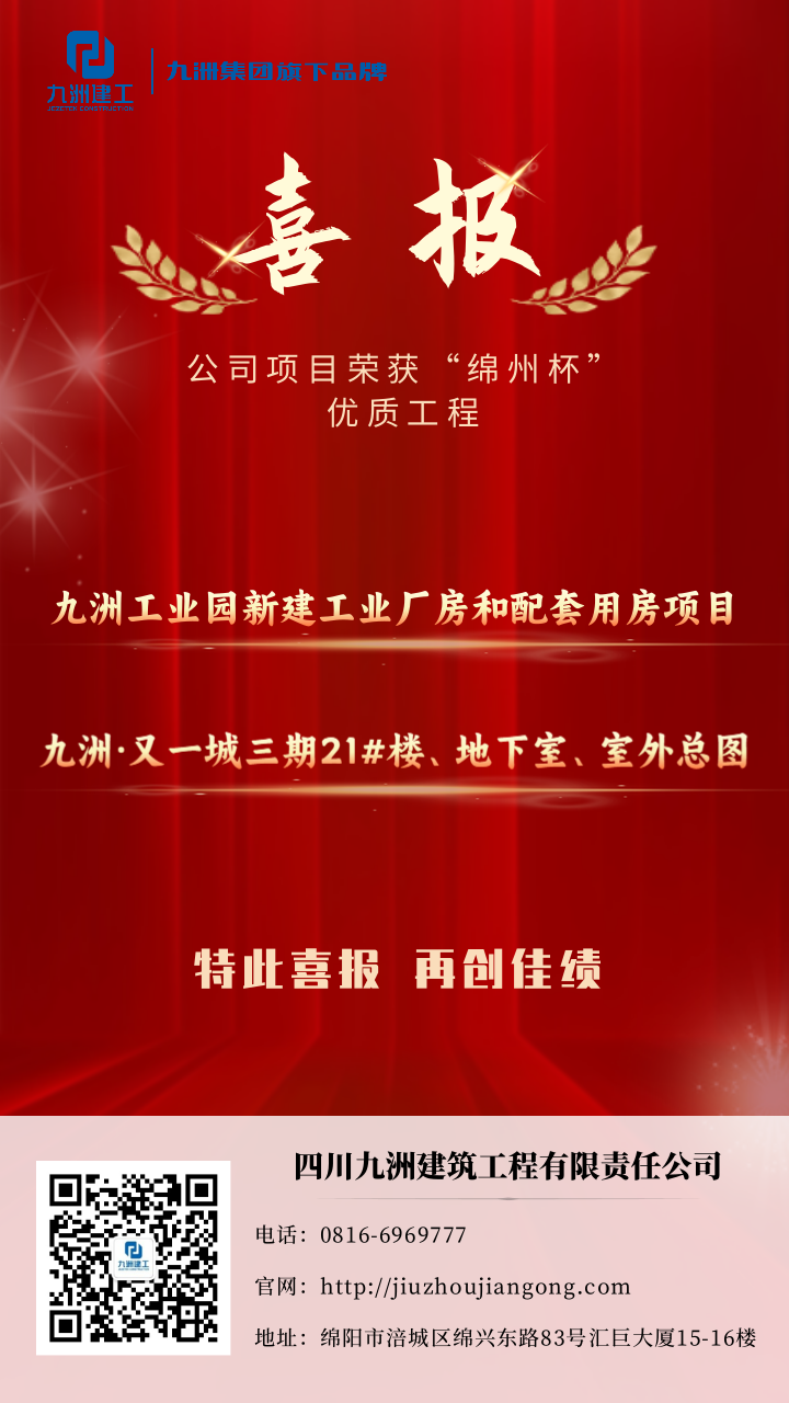 近日,绵阳市住房和城乡建设委员会官网公布,由四川九洲建筑工程有限责任公司承建的九洲工业园新建工业厂房和配套用房项目及九洲·又一城三期21#楼、地下室、室外总图,同时荣获绵阳市建筑工程质量最高荣誉奖项——2023度“绵州杯”优质工程奖。